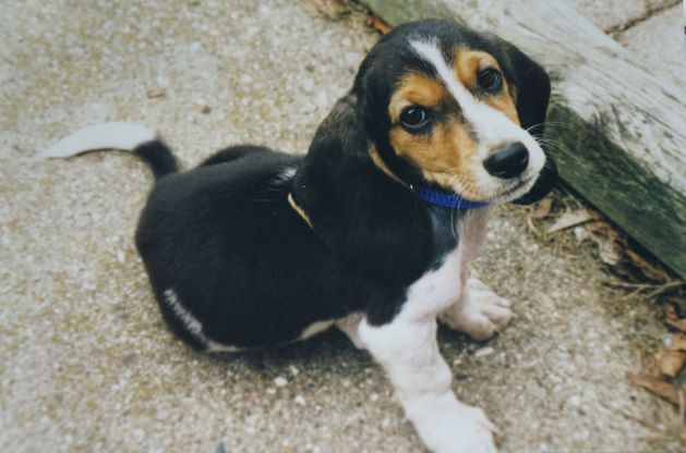 … in October 1998, I became a dog owner again. We found our family dog in an Arlington Heights pet store. A high-pitched bell at the top of the door jingled, signaling our arrival as we pushed through the entrance. Tom and I walked past a wall of cages containing an assortment of critters with doleful eyes tracking our every move. The noisiest of the bunch was a tri-colored basset hound puppy with a white-tipped tail, brown-and-white face, and voluminous black velvet ears. She barked, yelped, and wiggled near the latch of her cage as if to shout, “Look over here. Take me home. You will never find a better dog than me!”… I knew we had turned the page and a dog-eared corner. This tenacious pup had cast a spell on us.