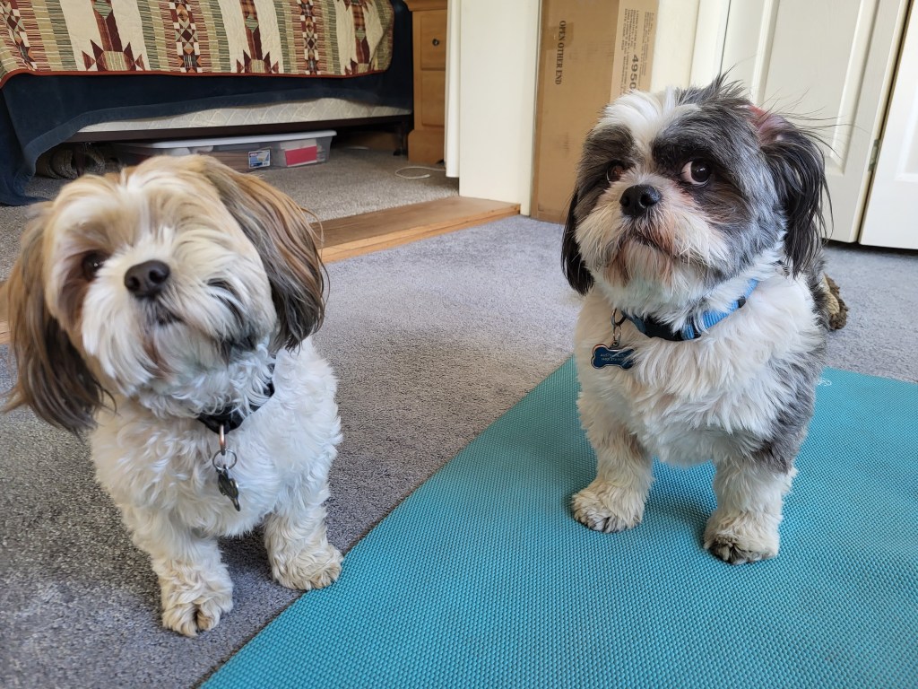 Miley and Milo couldn’t quite get the hang of downward facing dog, but they sure enjoyed licking my face while I stretched on our sunroom floor.