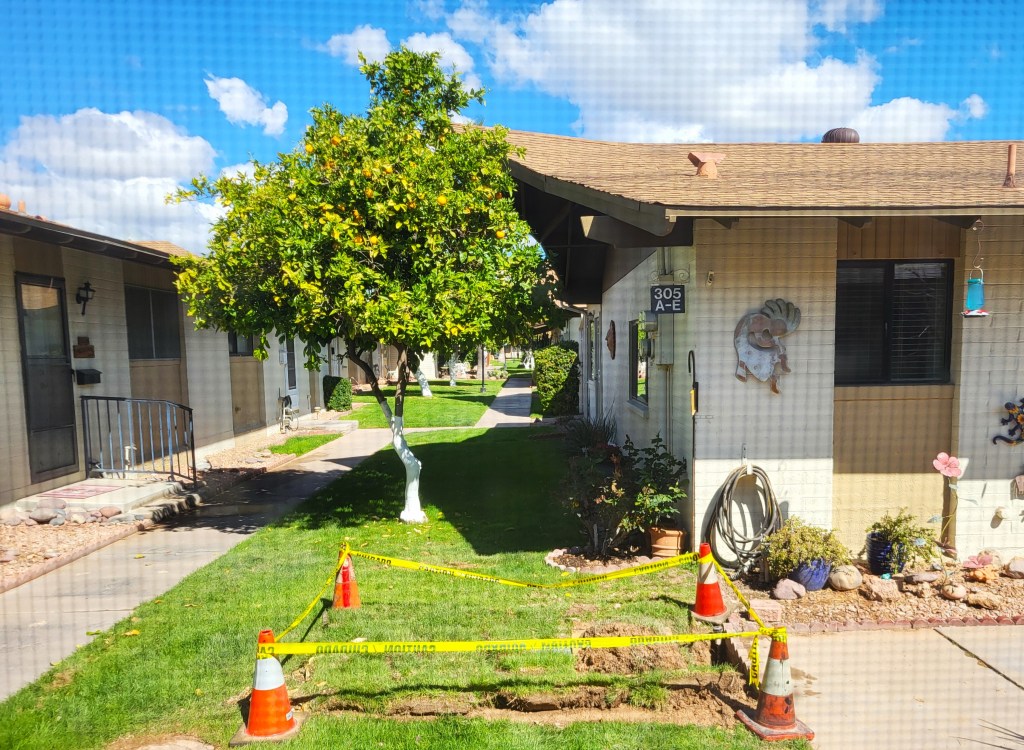Yes, there is a lot under construction inside my brain and around me as snowbirds tiptoe to and from the parking lot past the various plots of uneven ground the plumbing crew left in their wake.