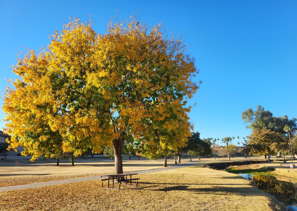 It’s easy to forget that trees turn color here, albeit much later than in the Midwest.