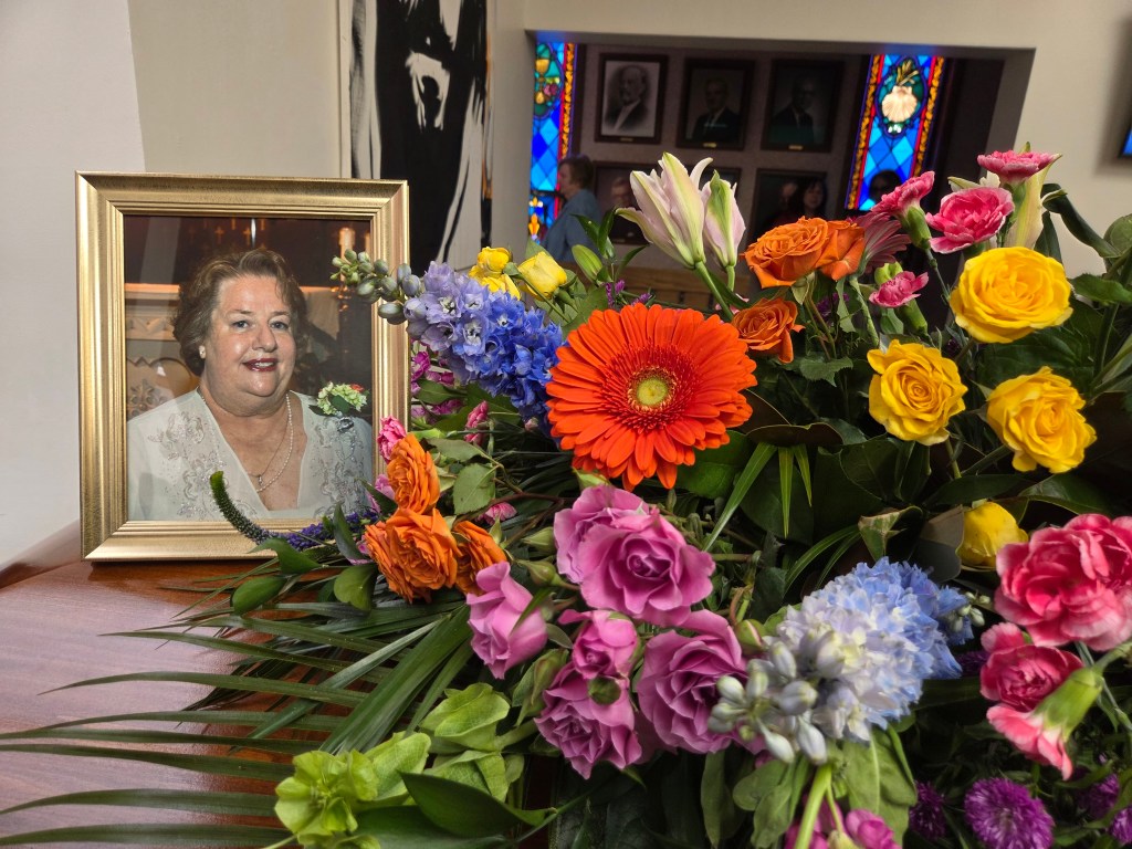 In a large open space connected to the church, Kelsey and Bryant had carefully assembled still photos–from throughout Phyllis’ life–on boards anchored by easels. They placed them beside her closed casket adorned with sprays of colorful blooms.