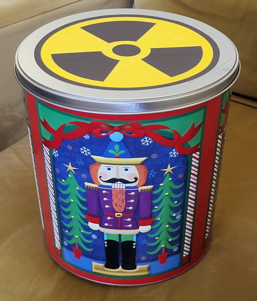 For about 15 seconds, I’ll be crossing the stage wearing an orange hazmat suit, while carrying a toxic fruitcake in this holiday tin. Meanwhile, the chorus will be singing this lyrical line: