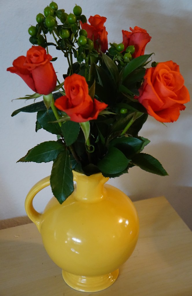 This week we brought home burnt orange roses to ogle over. As I freed them from the plastic wrap, the interior designer in me recommended placing them in my mother’s canary yellow Fiesta pitcher from the 1940s.