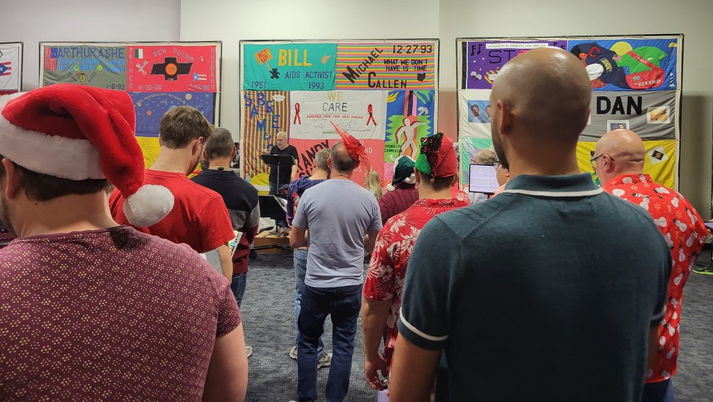 From my spot on the back row of the tenor two section, I captured fellow members of the Phoenix Gay Men’s Chorus–surrounded by AIDS quilts–rehearsing on November 28, 2023.